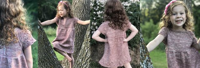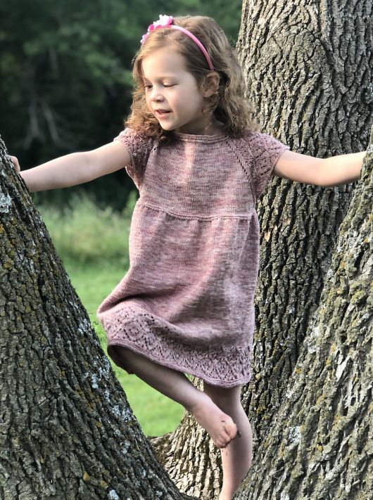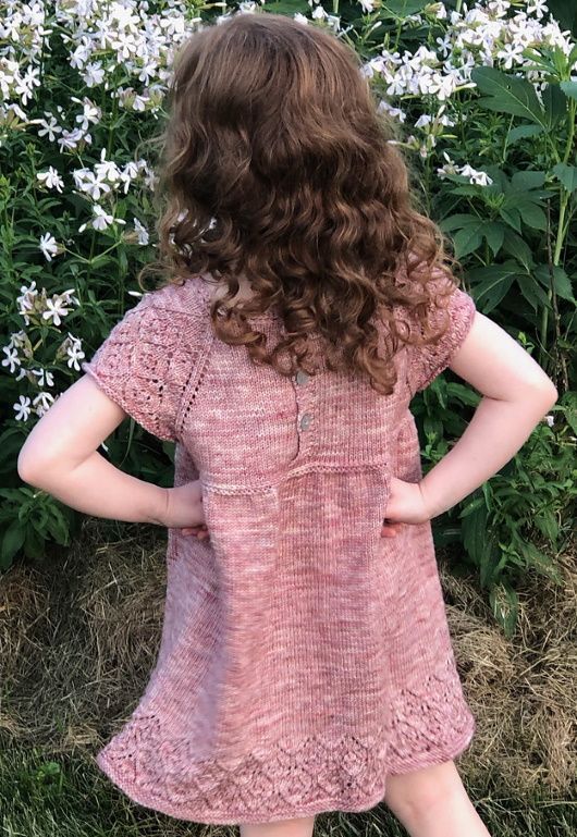 Симпатичное детское вязаное платье MoonGlade выполняется сверху вниз. Сначала платье вяжется поворотными рядами до талии, и затем вкруговую (секция юбки).