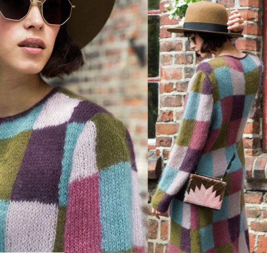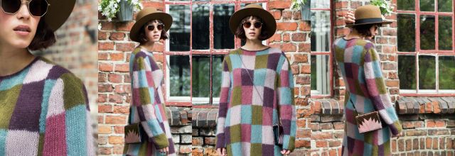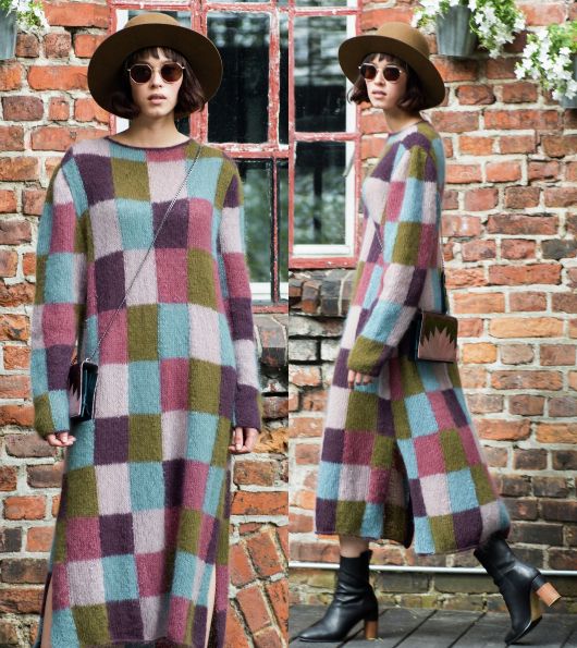 Длинное и свободное вязаное платье Queen выполняется лицевой гладью цветным шахматным узором.