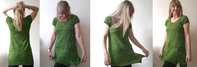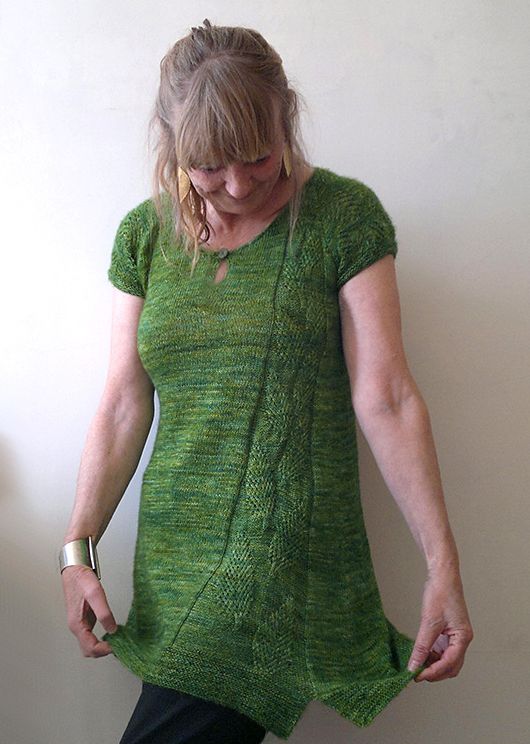 Greenhouse - это туника или платье, связанное спицами снизу вверх. Панель узора с листьями располагается на левой стороне переда и расширяется к низу. Рукава реглан сформированы совершенно по-особенному. Их вяжут укороченными рядами с отложенными петлями, которые помещают на держатель. Затем петли снимают на спицу и рукав вяжут сверху вниз без швов так же с использованием укороченных рядов.