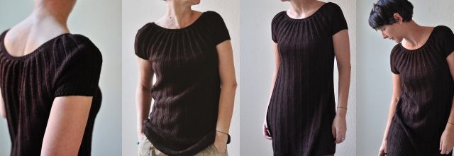 Вязаное платье-туника выполняется плавно сверху вниз узором резинка. Сначала вяжется кокетка до разделения рукавов. Затем петли рукавов откладываются на держатель/бросовую нить, а тело вяжется легкой A-образной формой вкруговую до нижней планки. После завершения тела, петли рукавов вяжутся вкруговую до нужной длины.