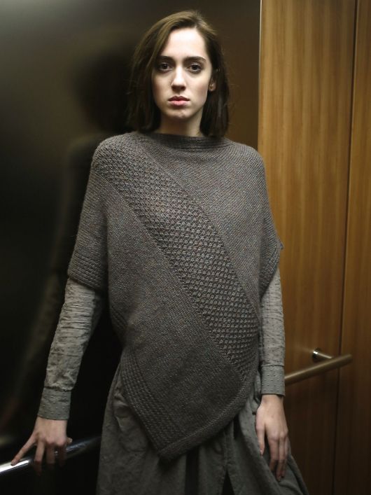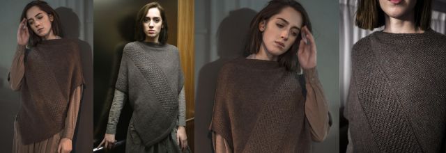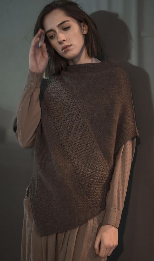Вязаное пончо TimesSquare выполняется одной деталью от нижней части спинки до нижней части полочки. Для плеча петли поднимаются по боковому краю и соединяется методом трех спиц. В завершении сшиваются только 2 коротких боковых шва, а все остальные детали будут соединены в процессе работы.