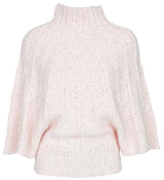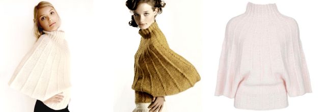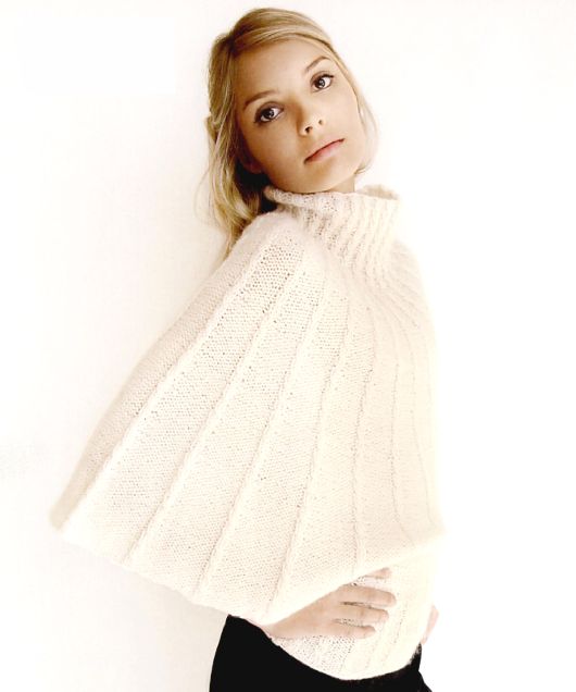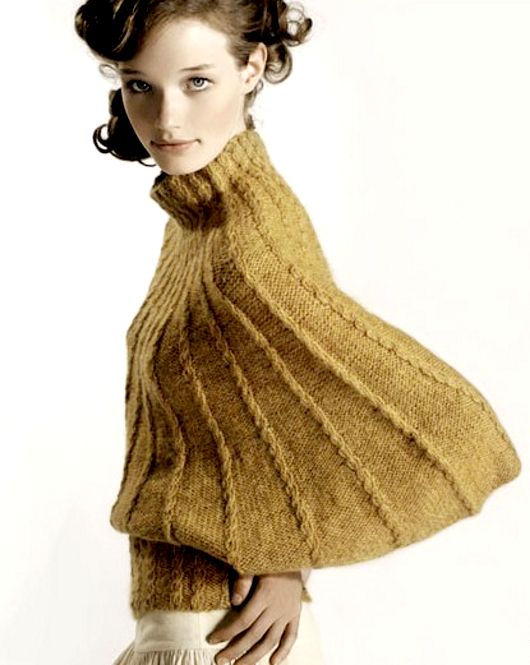 Вязаное спицами пончо Lavender выполняется круговыми рядами от верхнего края воротника-стойки до нижнего края простым узором из косичек с перекрученными петлями.