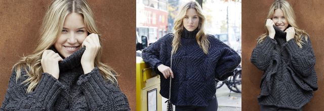 Свончо - это что-то среднее между свитером свободного кроя и пончо – стильная, удобная и практичная модель, которую можно надеть под джинсы или брюки, а также под юбку или поверх платья. Как правило, такие свончо вяжут сверху вниз, как свитер реглан. Но эта модель вяжется еще проще, она выполнена несложным узором в рубчик из треугольников, которые затем соединяются в квадратные мотивы с рельефным рисунком. После этого вяжутся манжеты рукавов «летучая мышь» и кайма по нижнему краю.