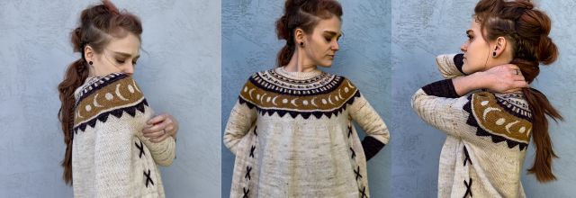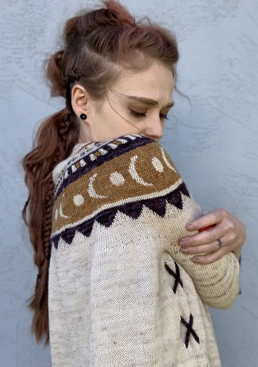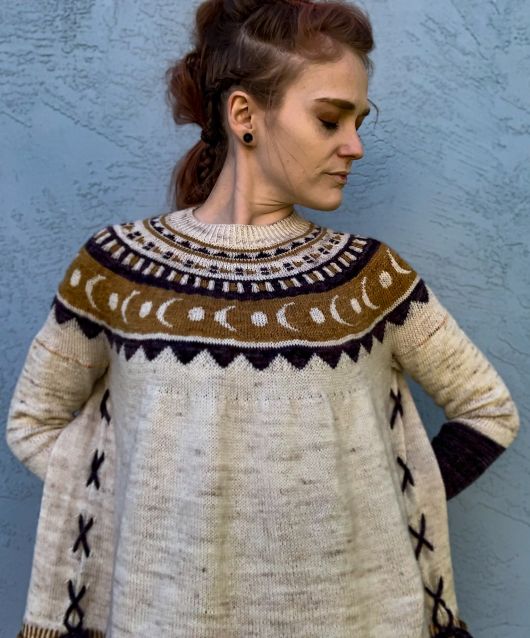 Свончо Moondrip связано сверху вниз по кругу на круговых спицах. Петли рукавов помещают на удержание и вяжут оставшуюся часть тела. Декор по нижней стороне провязан путем накидов и 2-х петель вместе лиц, это создает основу для того, чтобы вы могли продеть в эти отверстия шнуровку в конце вязания. Вы свяжете полый шнур, который проденете в отверстия по боковым сторонам.