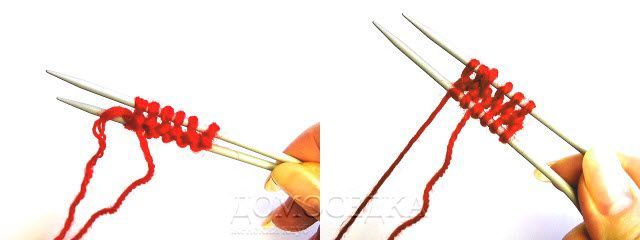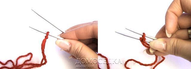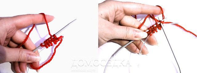 Держа пару круговых спиц параллельно в правой руке набрать 12 (12, 12) п. поочередно на каждую спицу по 1 петле = 6 (6, 6) п. на каждой спице.