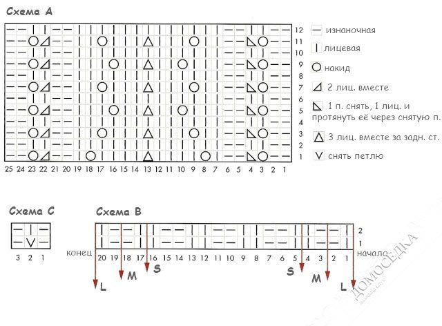 Далее вязать круговыми рядами: петли со спиц подъема по схеме А, петли со спиц ступни следующим образом: 3 п. по схеме С 1-го ряда, поместить маркер, 12 (16, 20) п. по схеме В (начинать и заканчивать в соответствии с нужным размером), поместить маркер, далее 3 последние п. со спиц ступни по схеме С.