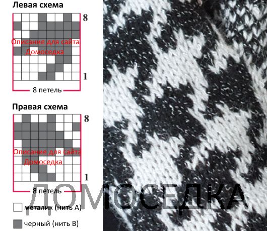 Связать 3 круга нитью А лицевыми петлями. Затем вязать нитью В 1 круг лицевыми, 1 круг изнаночными и 1 круг лицевыми петлями. Далее вязать узором гусиные лапки по правой схеме и выполить в высоту 3 повтора.