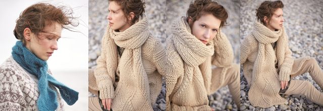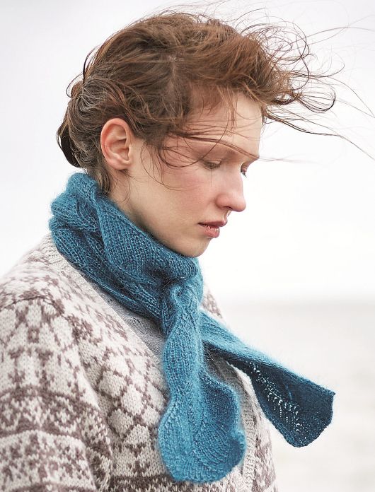 Вязаные шарфы для женщин Teacake выполнены спицами одним узором: первый, большой, из объемной пряжи и второй, маленький, из шелковистого мохера.