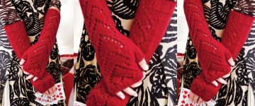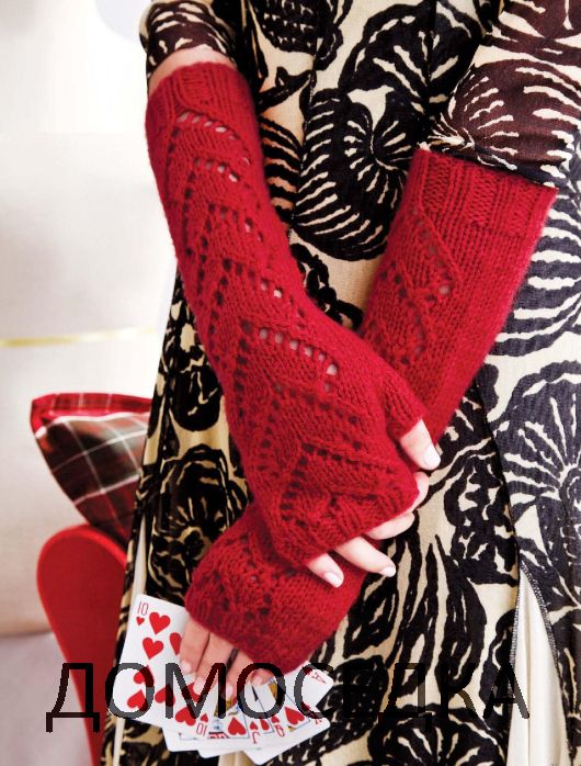 Высокие вязаные спицами митенки выполняются узором ажурными с сердечками. Дизайн от Debbie Stoller.