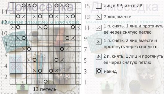 2-й ряд (ИС): 3 изн, далее 13 петель 2-го ряда по схеме, 2 изн, М (переснять маркер), 1 изн, М, 18 изн.