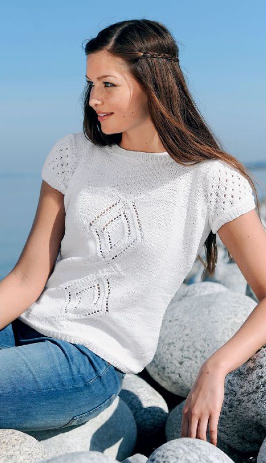 Симпатичный вязаный джемпер с короткими рукавами выполнен отдельными деталями которые сшиваются.