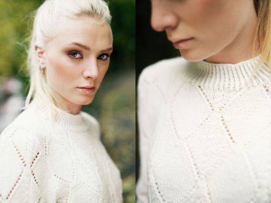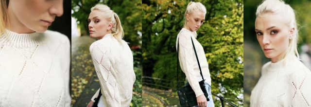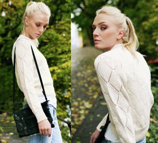 Белоснежный вязаный джемпер Adore с ажуром и косами выполнен по кругу снизу вверх.