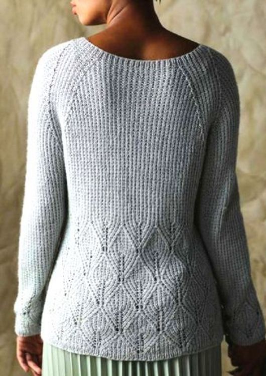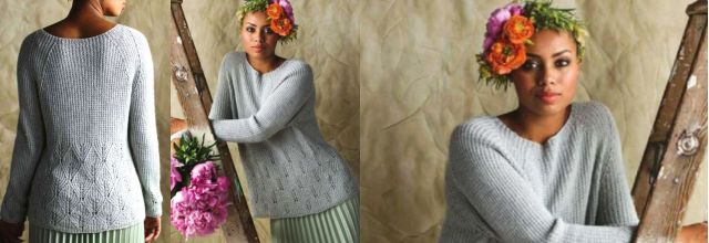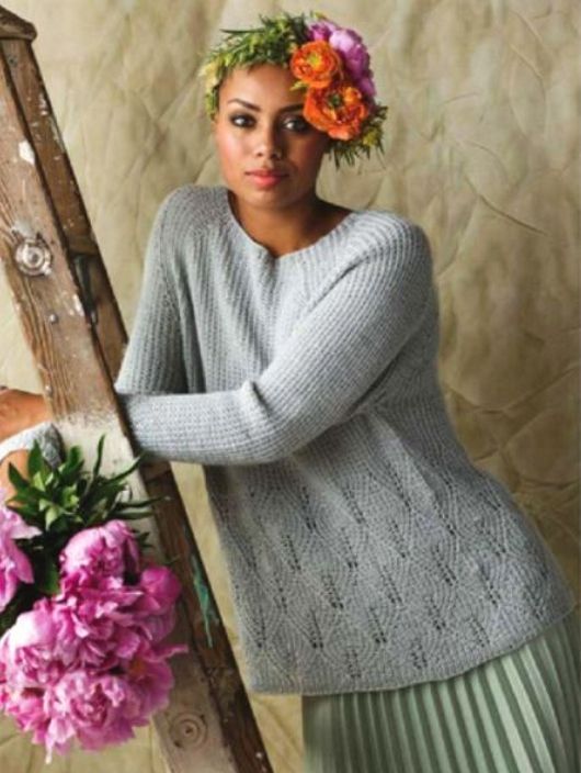 Вязаный джемпер Begonia начинает вязаться снизу рисунком ажурного листа, который выполняется вокруг тела и переходит в ломаную резинку, через широкую горловину. Тело джемпера связано по кругу от нижнего края до проймы. Талия не формируется, а длинные рукава и тело соединяются для образования реглана. Изделие связано из шелковистой пряжи небесного цвета.