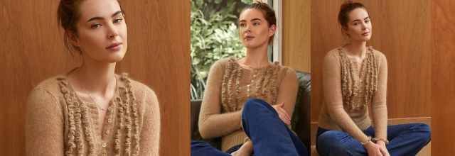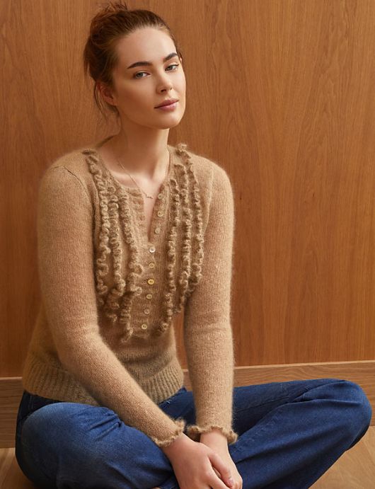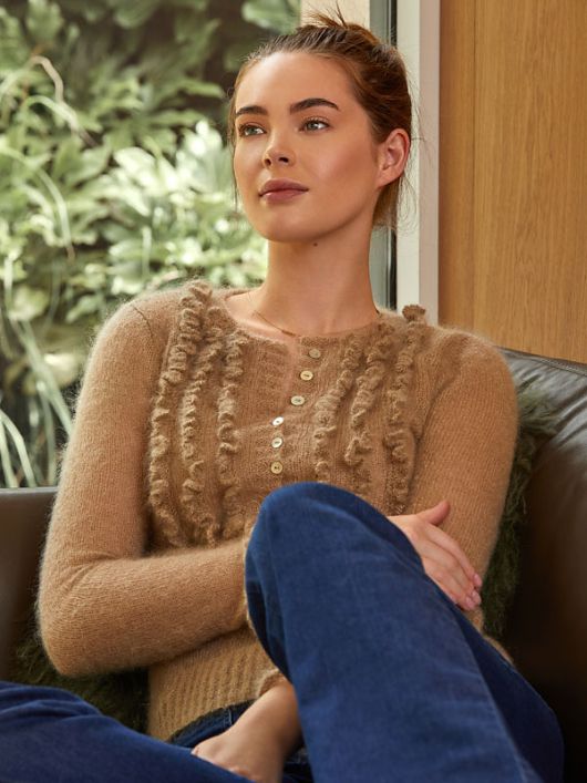 Изящный приталенный вязаный джемпер Effie с длинными вшивными рукавами на застежке спереди украшен нежными вертикальными рюшами. Пуловер выполнен поворотными рядами снизу вверх из отдельных деталей, которые затем сшиваются вместе.