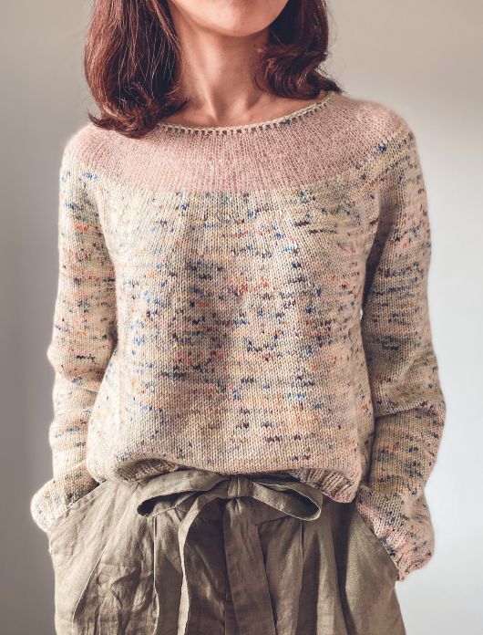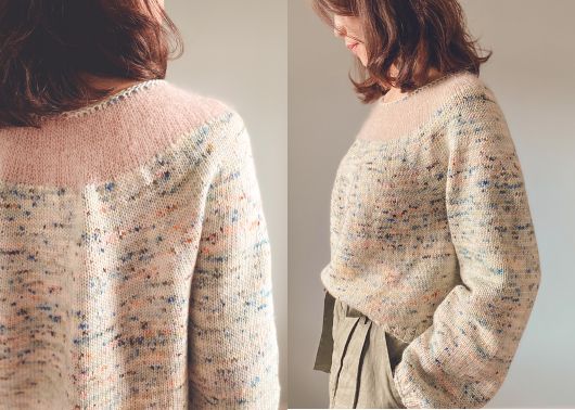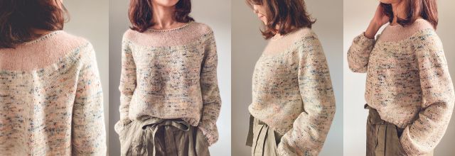 Вязаный джемпер Мисти выполняется без швов сверху вниз. Для формирования более высокого выреза горловины спинки вяжутся несколько укороченных рядов.