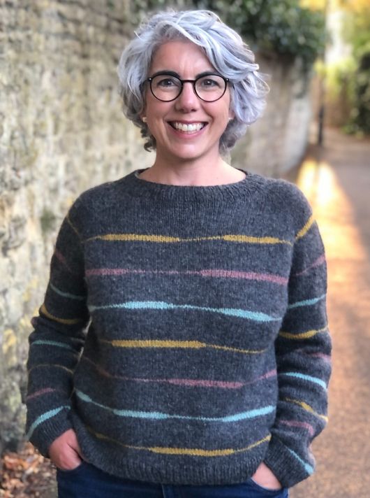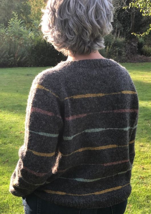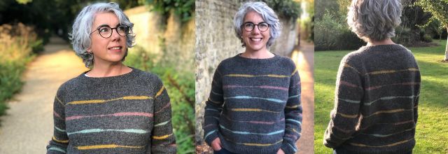 Вязаный джемпер Oles выполнен верху вниз по кругу. После горловины добавляют укороченные ряды для поднятия спинки и провязывают прибавки с каждой стороны рукавов. Затем рукава и тело отделяют. Вы продолжаете вязать тело и позже поднимаете петли рукавов, находящиеся на удержании и вяжете их от подмышки до манжеты. Полосы цветного узора, провязывают укороченными рядами на протяжении всей работы.