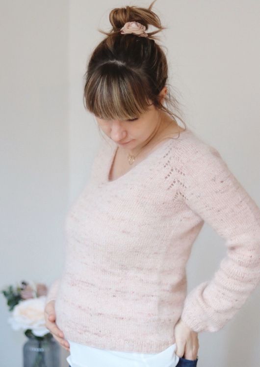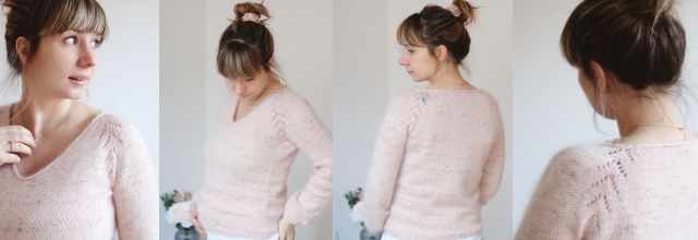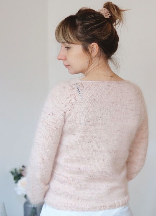 Вязаный джемпер Rosa выполнен лицевой гладью без швов и украшен прекрасным ажурным узором на линиях реглана. Он имеет глубокий V-образный вырез горловины, отделанный шнуром I-cord, который придает пуловеру очень женственный вид. Запястья и нижняя часть тела провязаны резинкой. Вы можете связать его из двух нитей пряжи, сложенных вместе (тонкая пряжа и мохер), или в одну нить спортивной пряжи, чтобы сделать его легче.