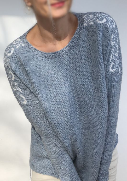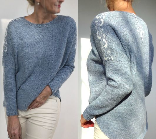 Весна, добро пожаловать со свежими цветами! Элегантный цветочный узор с завиточками по плечам и пикантный квадратик цветочного мотива на спинке превращают вязаный джемпер SpringSquare в нечто особенное. Вяжется джемпер сверху вниз без швов, длину и ширину выбирайте по своим предпочтениям. Модная форма спущенного плеча и удобная ширина джемпера придают превосходный комфорт.