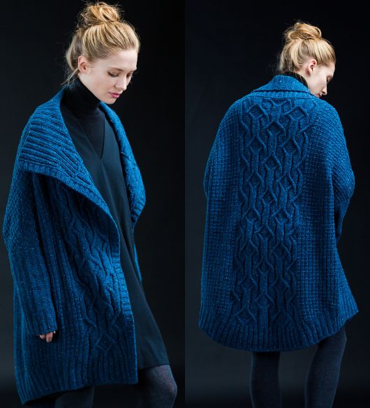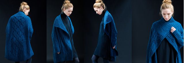 Архитектурные узоры в сочетании с плавными объемами составляют основу этого эффектного кардигана Belfast. Укороченные ряды на планке спинки создают красивую форму колокола удлиняя тем самым панель узора красивых аранов, состоящих из сочетания гребней и полос с мотивами текстурной резинки на спинке. Убавки внутри узора резинки воротника позволяют красиво ложится на плечи, планки, планки полочек отделаны двойной резинкой. Рукава связаны текстурной резинкой являются продолжением заниженного плеча. Связанный из пряжи Shelter, кардиган Belfast является очень элегантным и одновременно очень уютным.