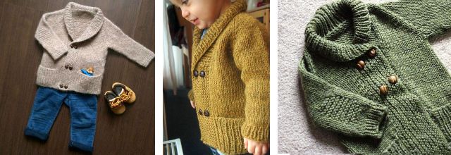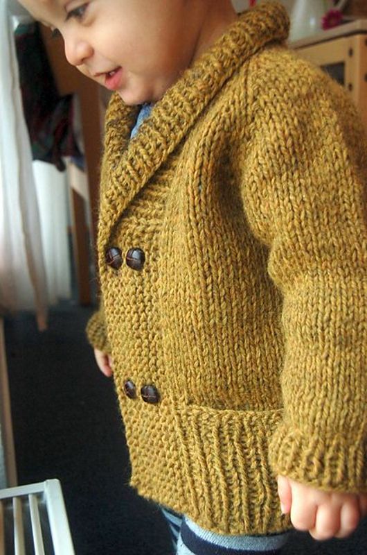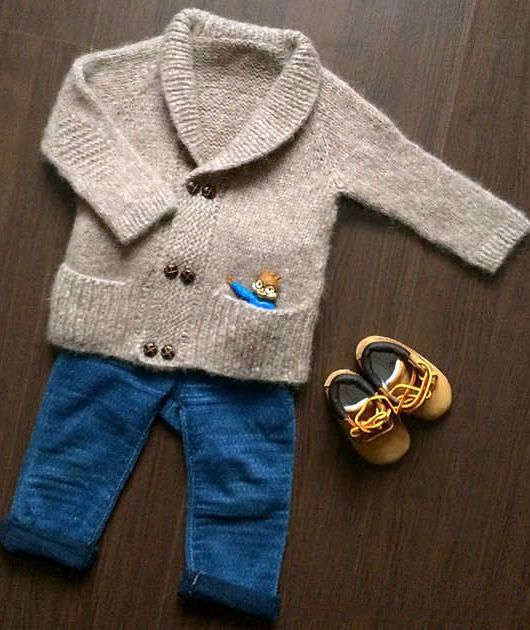 Детский вязаный кардиган выполняется спицами сверху вниз. Тело вяжется прямо; рукава выполняются по кругу. Петли поднимаются вдоль боковых краев и вырезу горловины для планок пуговиц и воротника. Можно дополнительно выполнить карманы. Их подкладка требует небольшого сшивания.