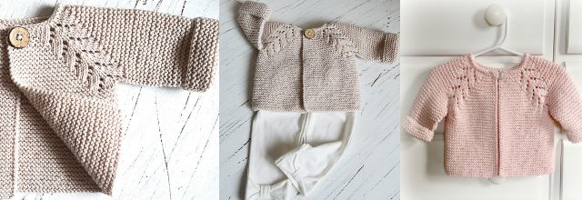 Симпатичный детский вязаный кардиган выполнен спицами сверху вниз платочной вязкой. Линии реглана формируются ажурным узором Norwegian Fir (Норвежская ель).