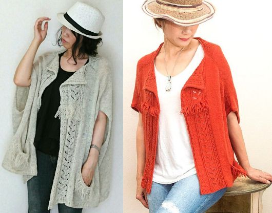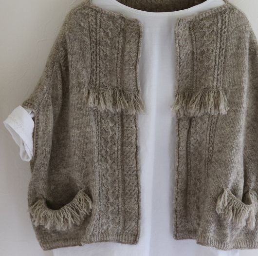 Оригинальный вязаный кардиган-накидка в стиле оверсайз The Little Garden, с укороченными рукавами, выполнен спицами комбинированной вязкой текстурных и ажурных узоров. Спинку, полочки и карманы украшает бахрома. Кардиган вяжется спицами, одной деталью без швов сверху вниз поворотными рядами.
