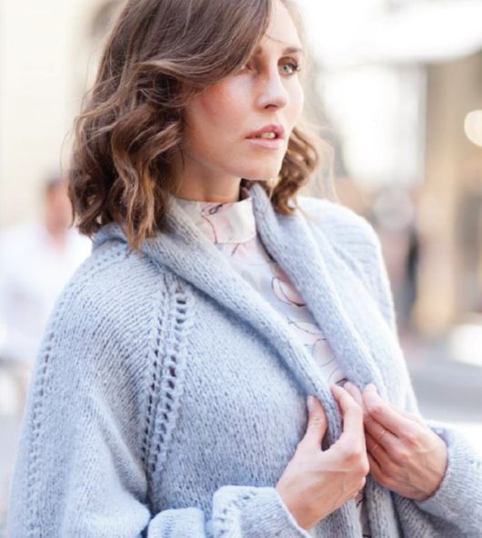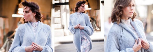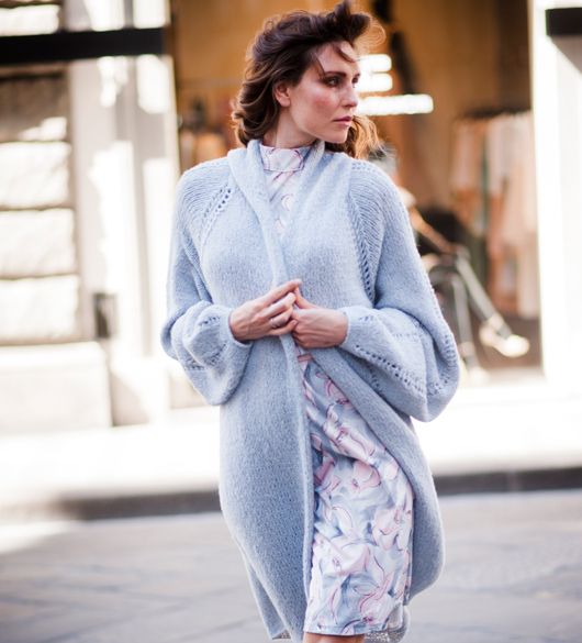 Удивительно нежный светло-серый длинный вязаный кардиган-пальто с рукавами реглан, отделанный кантом из полого шнура. Кардиган связан снизу вверх из отдельных деталей. Линии конструкции подчеркнуты узкими полосами изящного ажура.