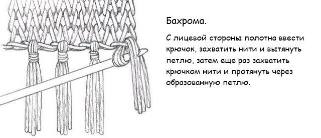 Закрепить рабочую нить. Сбросить по 5 оставшихся петель с обеих сторон и распустить до основания. Расправить нити и разрезать образовавшиеся длинные петли. Выполнить с помощью крючка бахрому (см. фото).