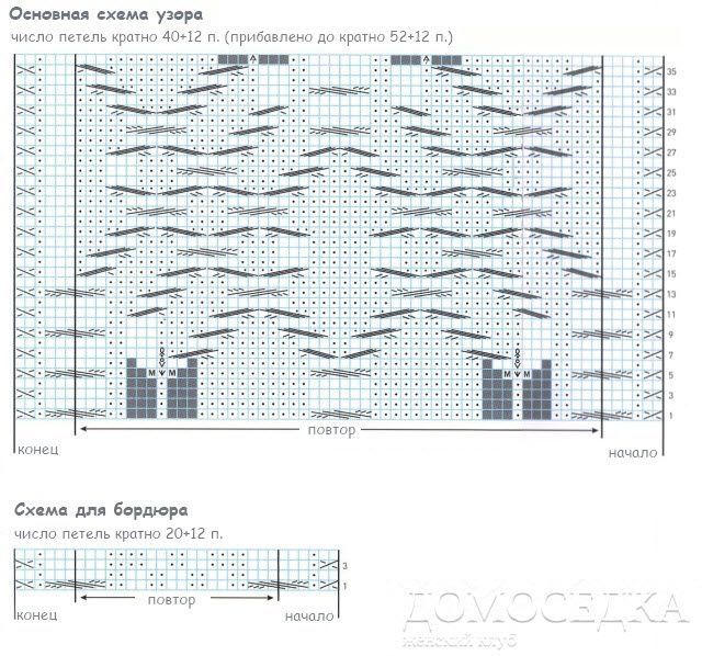 Продолжить как установлено. Связать 5 см. Закончить в конце 4-го ряда схемы узора для бордюра. Перейти на круговые спицы 5 мм и продолжить следующим образом: