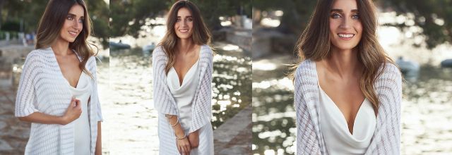 Широкий вязаный спицами шарф-палантин выполнен ажурным узором из поперечных полос. Несмотря на большой размер, этот палантин очень легкий и красиво драпируется по плечам. Форма такого палантина – обычный прямоугольник.