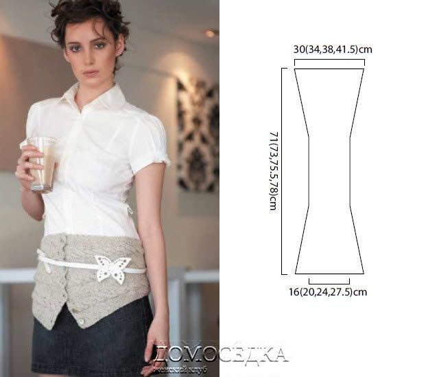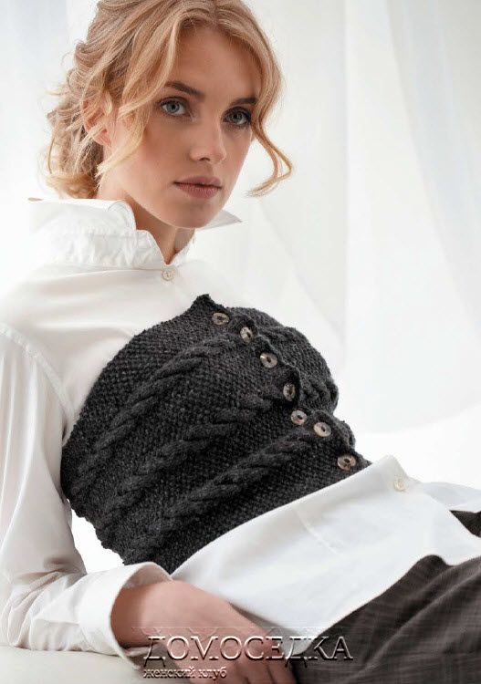Вязаный пояс с пуговицами выполнен спицами узором со жгутами. Модель для молодых и модных.