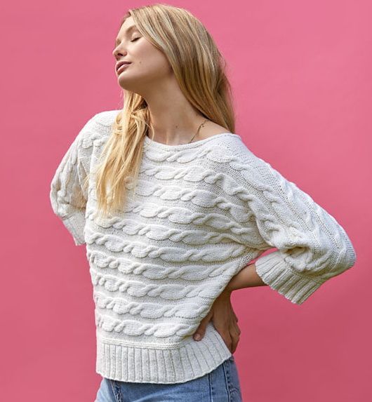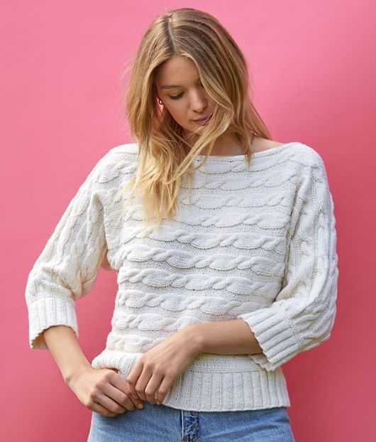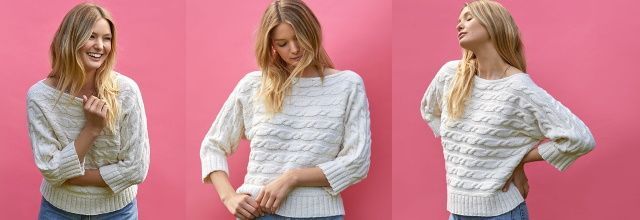 Вязаный спицами просторный женский пуловер Gratitude с роскошным узором из горизонтально кос, неглубоким круглым вырезом горловины и цельновязанными рукавами «летучая мышь» длиной три четверти. Спинка и перед пуловера вяжутся раздельно в поперечном направлении, прямыми и обратными рядами, начиная от манжет рукавов.