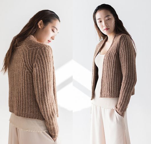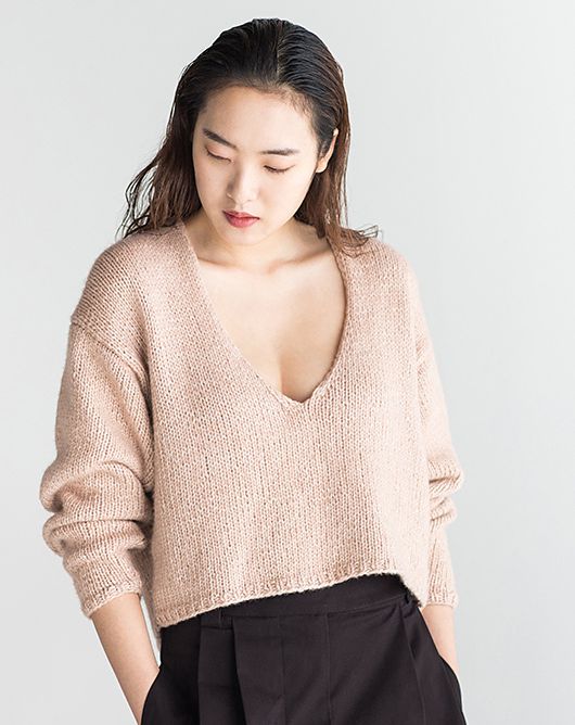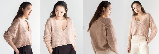 Укороченный пуловер Kirsebaer вязаный спицами отдельными деталями, которые затем сшиваются. Плечи полочки переходят на спинку, создавая наклонный шов.