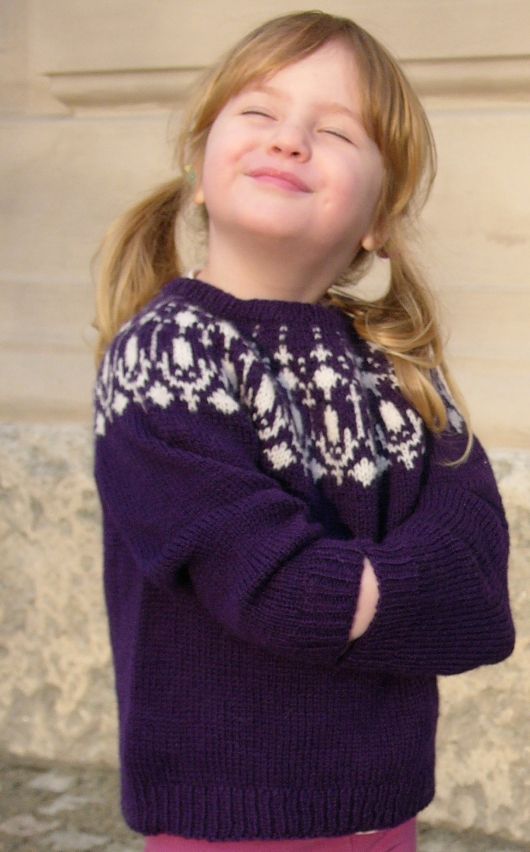 Симпатичный детский вязаный спицами пуловер Kristina выполняется сверху вниз вкруговую.
