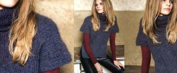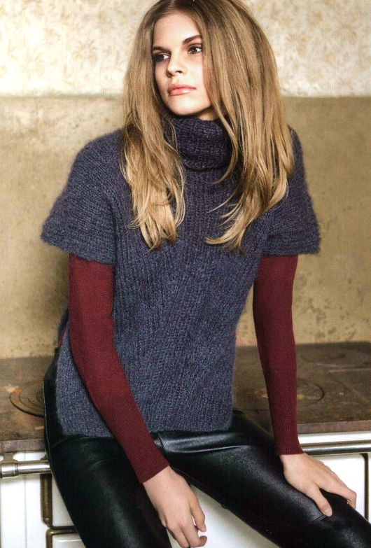 Вязаный пуловер Mohairnuovo без рукавов с большим воротником выполнен спицами двумя деталями, которые сшиваются.