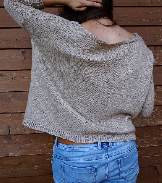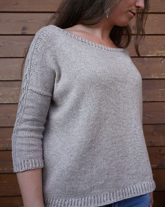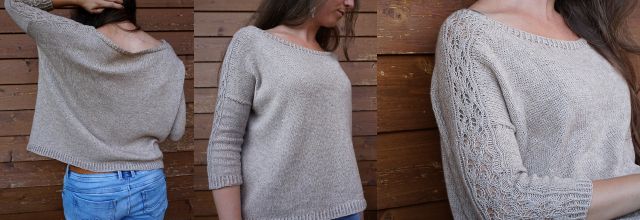 Вязаный пуловер Rambling Rose начинается с выполнения двух ажурных панелей для плеч. Затем петли поднимаются вдоль боковой стороны панели для переда и с другой стороны для спинки. Начинается с вязания лицевой гладью поворотными рядами и затем соединяются петли в круг когда горловина будет готова. Плечи формируются укороченными рядами. Тело вяжется в круговую лицевой гладью с припуском на свободу облегания. Рукава выполняются вкруговую сверху вниз до нужной длины.
