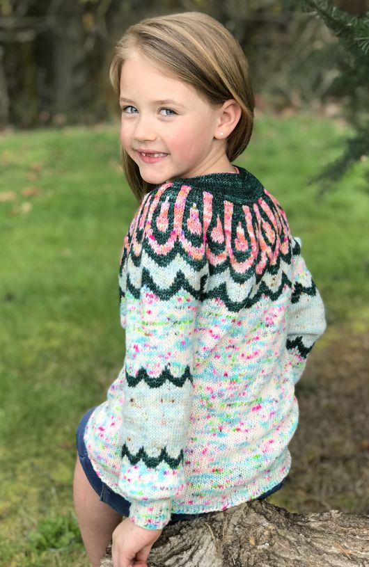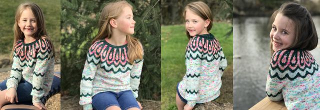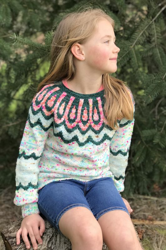 Красочный вязаный пуловер SunsetHighway для девочки выполнен спицами сверху вниз. Пуловер вяжется круговыми рядами. Работа начинается с вязания цветной кокетки с укороченными рядами для лучшей посадки по горловине. Затем идет разделение на тело и рукава.