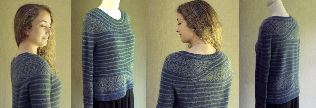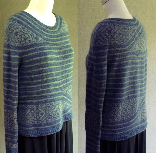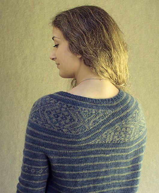Интересный вязаный пуловер TiaTeva с бретонскими полосками и асимметричным жаккардом. Короткие секции жаккарда не просто красивы, они придают форму выреза горловины, а также добавляют небольшой изгиб в линию подола. Пуловер вяжется одной деталью сверху вниз. Секции с полосками выполняются по кругу, а некоторые участки жаккарда выполняются поворотными рядами.