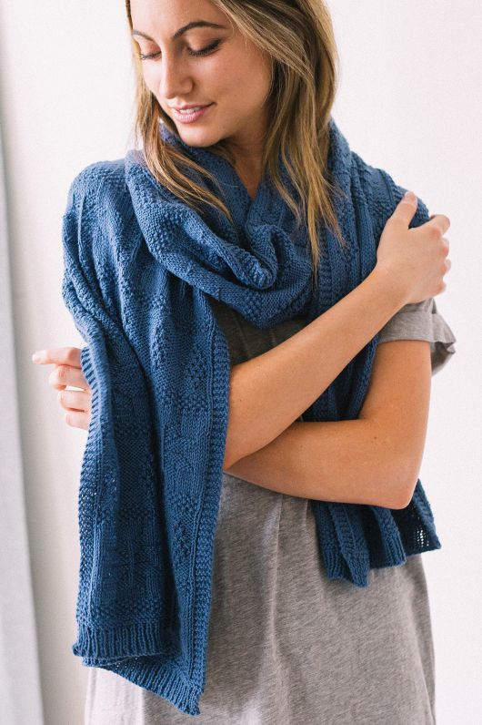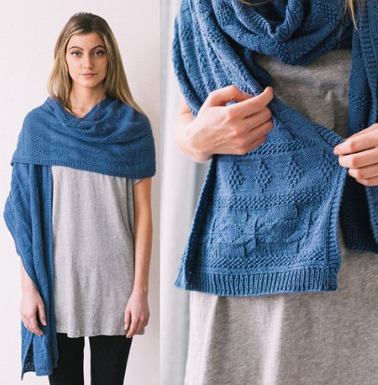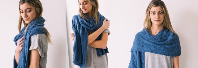 Широкий и длинный вязаный шарф Adrian выполнен спицами красивым рельефным узором из лицевых и изнаночных петель.