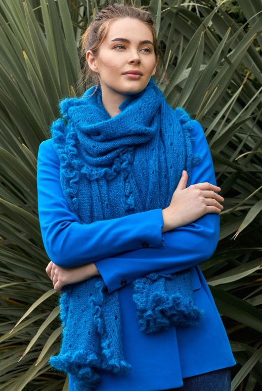 Эффектный вязаный аксессуар - шарф Brice с нарядной оборкой из рюшей по краям согреет вас в холодный день и завершит ваш стильный образ. Шарф выполнен гладкой вязкой с узором из дырочек, а оборка шарфа связана крючком.
