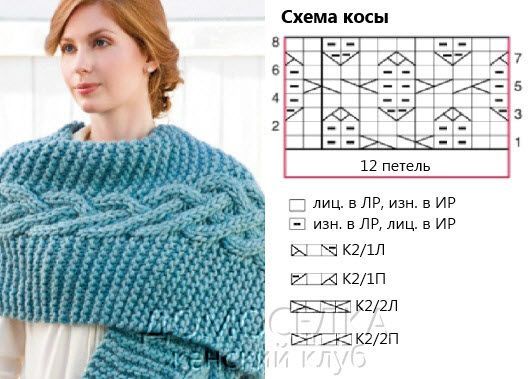Установочный ряд (ЛС): 12 лиц., затем вязать 12 петель 1-го ряда косы по схеме, далее 12 лиц.
