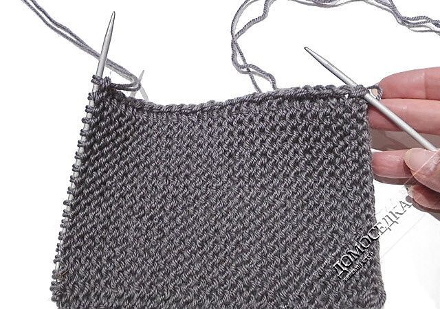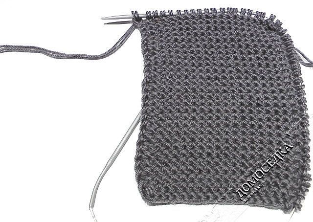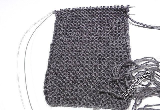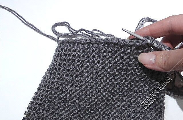 Набрать 20 петель. Оставить отрезок нити после набора примерно 80-100 см. Вязать платочной вязкой (только лицевые петли во всех рядах) 56 рядов (26 рубчиков).