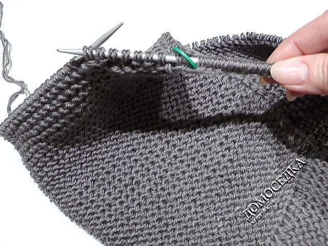 По правой боковой кромке снизу вверх, используя оставленный отрезок нити, поднять 25 лиц., далее вязать 20 лиц. c левой спицы = 45 п.