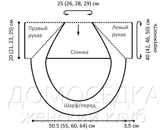 1-й круг: перенести 75 (81, 87, 93) петель рукава на круговые спицы диной 40 см и отложить, далее вязать 96 (104, 114, 122) петель спинки узором Мох, перенести следующие 75 (81, 87, 93) петель второго рукава на круговые спицы длиной 40 см и отложить, затем закрыть 366 (372, 378, 384) петель шарфа как лицевые.