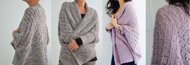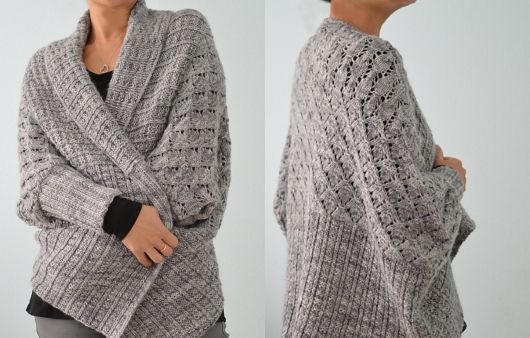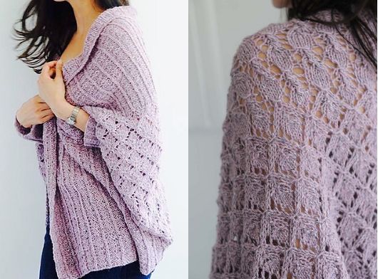 Роскошный вязаный шраг-кардиган с текстурными узорами, широкими рукавами «летучая мышь» и драпирующимися полочками выполнен так, что его можно носить «вверх ногами», и тогда у него будет шалевый воротник. При носке полочки красиво ниспадают и драпируются. Их можно также скрепить декоративной булавкой. Как бы вы его не надели, все равно будете выглядеть красиво и стильно!