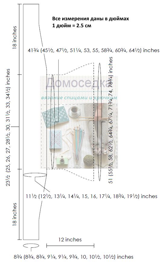 Окружность бюста: 31 (34, 36, 38, 41, 44, 47, 50, 53) дюймов (1 дюйм = 2.5 см).