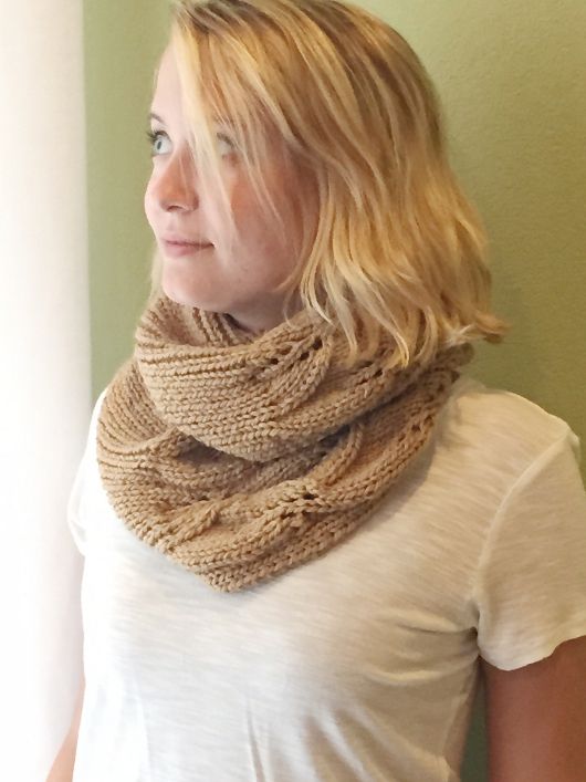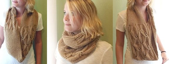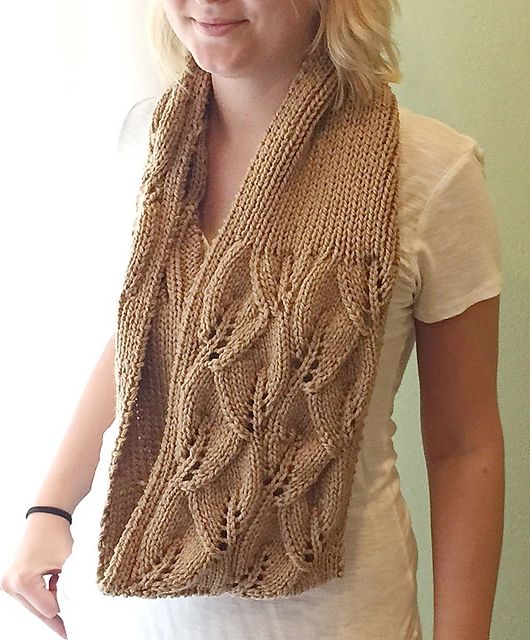 Симпатичный вязаный снуд Arborista выполнен спицами красивым узором с листьями.