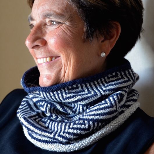 Оригинальный вязаный снуд Conic можно носить как обычный воротник или поднять, чтобы накрыть голову. Вязание снуда в технике тканого полотна, является прекрасным способом создания красивой цветовой гаммы. Геометрический узор формирует «оптическую иллюзию», напоминающую движение.