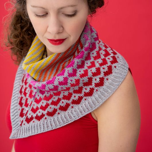 Красивый яркий вязаный снуд LikeCandy с узорами в виде разноцветных полос и сердечек. Снуд имеет очень удобную форму в виде треугольника спереди и более узкой части сзади, что позволяет ему красиво лежать вокруг шеи. И еще это отличный способ использовать маленькие клубочки остатков разноцветной пряжи из ваших запасов. Снуд вяжется без швов сверху вниз сначала поворотными, а затем круговыми рядами.