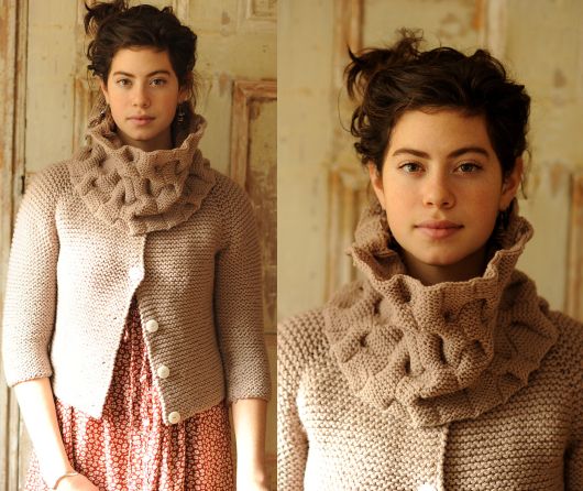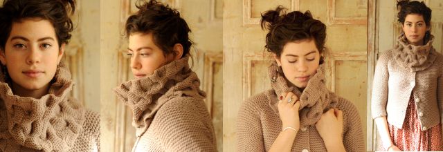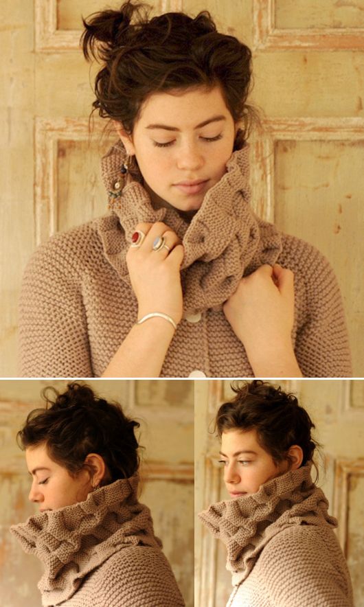 Вязаный снуд Serafina выполнен спицами круговыми рядами плетеным узором.